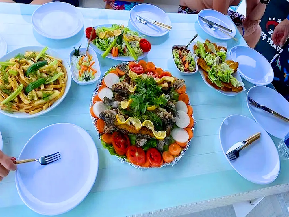 Для гостей предусмотрено питание с сервировкой: подаются свежеприготовленная жареная рыба или курица, гарниры и разнообразные салаты. Также включены прохладительные безалкогольные напитки и сезонные фрукты, которые прекрасно дополняют отдых.